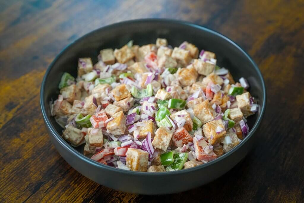 - Toss gently – The tofu breaks if you stir too hard. Fold it in with the dressing, do not shake the bowl around.